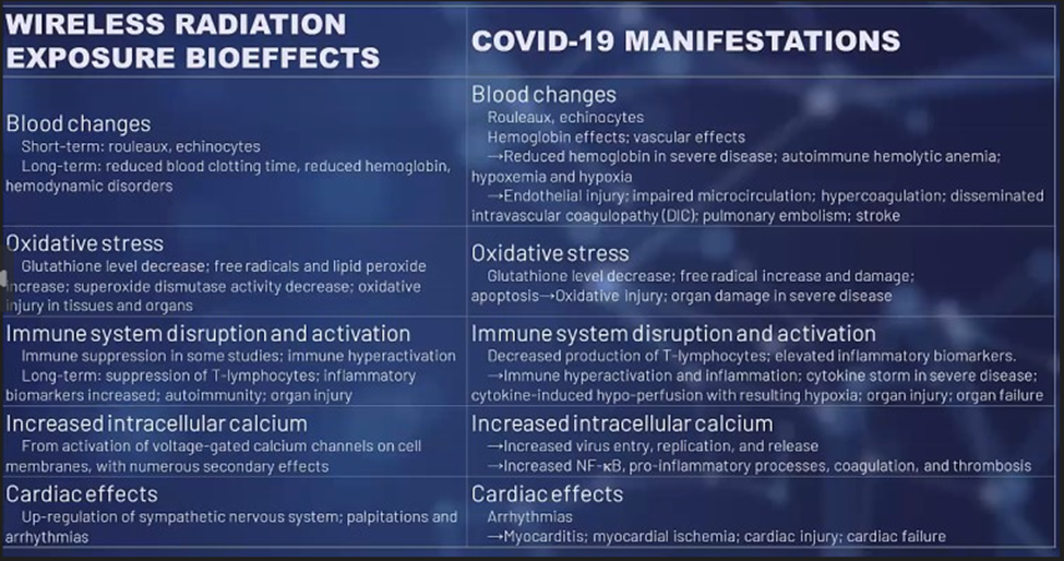 Dr Rubik then compared the adverse health effects of wireless 5G to those of Covid-19 infection. They are remarkably similar. They both include clumping of red blood cells, vascular problems and oxidative stress.