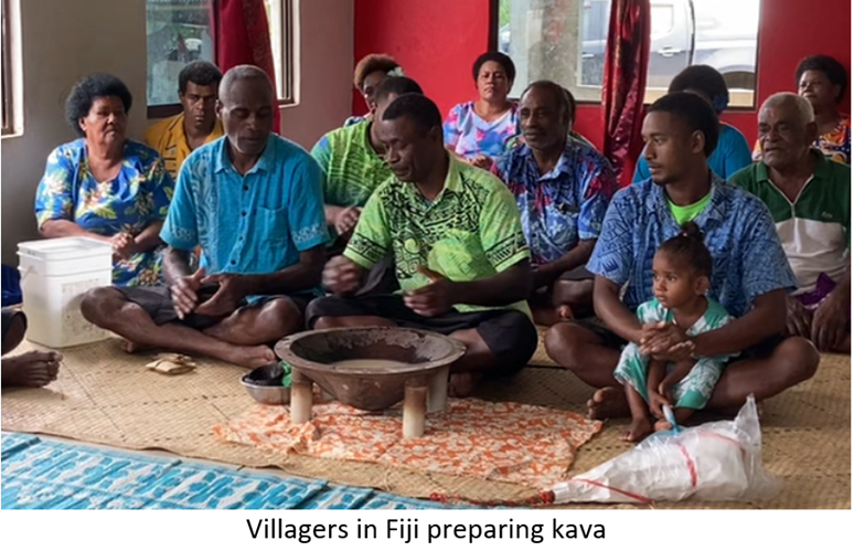 Below are native Fijians preparing the kava drink (in the large bowl) to welcome us to their village. The Chief of the village drinks first. My husband was designated the “chief” of our tourist group and was the first person on our side to accept the drink. (He said it tasted a bit “muddy” with a touch of mint). With graciousness we survived the welcome ceremony and drank our kava.
