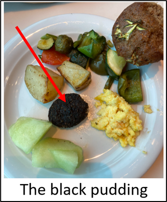 I see that Black Pudding shows up on the buffet, next to the roasted vegetables. What is black pudding? If you are from the United Kingdom, you would know that black pudding is not really “pudding” at all. It is a food item prepared from pork blood and pork fat, and it is considered a type of blood sausage.  It also includes some sort of cereal grain— often oats or barley—along with spices. This dish, or some variation of it, has been eaten for centuries not only in the United Kingdom but also in other places around the world.