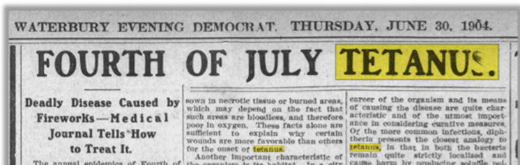 Tetanus was well known in the civilian community as well. Fourth of July fireworks caused injuries in adults and children and prompted newspaper write-ups like the one above from 1904.