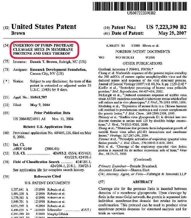 The spike protein is the source of all of this trouble.  The vaccine delivers messenger RNA to your body so your body will produce the novel spike protein with the hope that you will develop antibodies to the protein.  Sounds good until you find out that the spike protein is not “novel” and it is not harmless.  It was patented at least 20 years ago by a lab at Chapel Hill NC and similar work was patented later by Pfizer and the CDC.  It was designed to target cells of lung tissue as well as epithelium cells lining blood vessels.  It has crossed the blood/brain barrier and causes neurological issues. How do I know this?  A patent lawyer by the name of Dr David Martin has investigated the many PATENTS on the SARS corona virus’s and spike protein over the past 20 years (picture of one patent below).  It is worth watching his hour and a half video where he explains the history of this pathogen.  (In the video he is talking to a German patent lawyer who is mounting a class action lawsuit against European health agencies that are forcing the vaccine.)  If you want to quickly glance through his slides, go HERE. It can be argued how the virus found it’s way to a Wuhan lab/wet market, but what is clear from Martin’s investigation is that the spike protein was altered on purpose to increase it’s gain of function and pathogenicity.