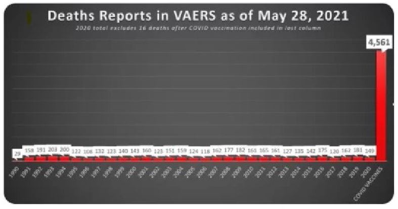 What are the potential side effects of the Covid-19 vaccines?  The only government agency that is tracking side effects in the USA is VAERS which is run by Health & Human Services.  Since this is a database showing correlation (not causation) you have to be cautious.  Below is a plot of vaccine events (deaths) over the past 20 years.  The number of deaths for every year leading up to 2021 is about 200 or less/year for ALL vaccinations in the USA.   When the Covid vaccines rolled out at the beginning of 2021 the number of events (deaths) skyrocketed to 4561 (January to May 2021).  The VAERS database is generally considered to be only a fraction of the real events as most doctors do not bother to enter a patient’s vaccine reaction.
