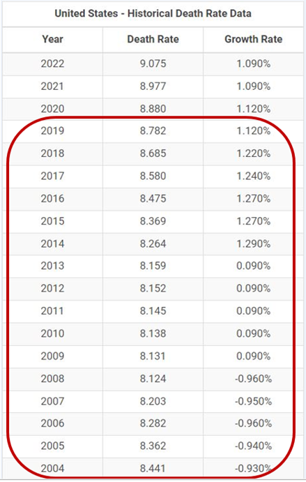 The insurance industry keeps a close eye on death rates. The death rate is often expressed as the number of deaths per 1,000 of the population per year. The death rate does not change much year to year. A certain number of people die every year across the United States due to old age, accidents or disease. The death rate has been in the “8’s for some number of years as shown below. (The chart below is found here.) All 2020 and later data in the chart below are UN projections and DO NOT include any impacts of the COVID-19 virus. But if you look at pre-2020 you will see that the death rate is stable in the “8’s”.