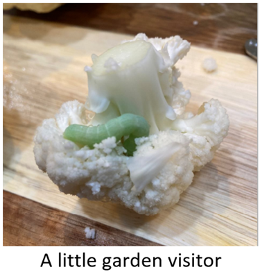 I cut the cauliflower into nice, small pieces so they would fit into my quart Mason jar. I found some dill seed (not to be confused with dill weed) in the back of my pantry. I even found a bay leaf. You can add almost any spice you like to a fermented vegetable. As I chopped, I found a little friend…