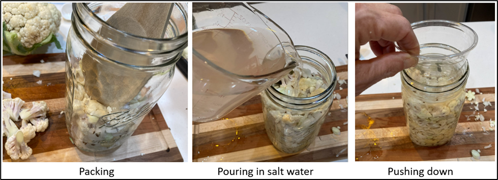 - Mix about 2 cups of water with the 1 T sea salt. Pour the salt water into the jar. You should be able to cover the cauliflower completely. (Mix more water and salt if needed.)