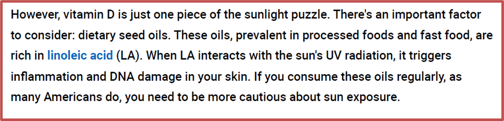 2. Seems our bodies were not built to run on plant seed oils. In one article I read, a pig farmer found his pigs’ adipose tissue was softer and had less integrity when fed a steady diet of feed containing large amounts of linoleic acid. And then there is the connection you highlighted in your article; which is that overconsumption of seed oils causes the skin to burn more rapidly when exposed to the sun. I am glad that more people are waking up about the importance of diet in maintaining health and well being. Perhaps one day soon we can give Big Pharma a run for their money. Thanks for your informative articles on this and many other health related topics.