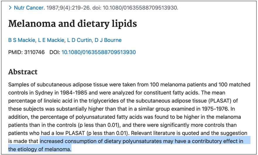 There is a strong association between Linoleic Acid intake and an increased risk of developing different types of skin cancer: squamous cell carcinoma, basal cell carcinoma, and melanoma. (ref) Removing seed oils (high in Linoleic Acid) dramatically reduces UV-induced sunburn risk. (ref). The more Linoleic Acid in the diet, the more UV damage the skin experiences. (refref)